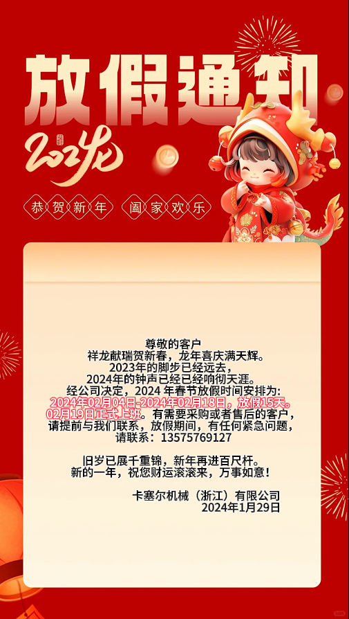 2024年卡塞爾機械(浙江)有限公司放假通知